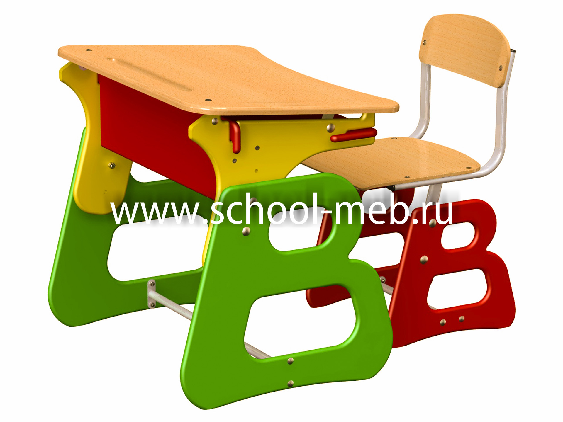 Парта снабжена полкой. Столешница поднимается для более удобного доступа к содержимому полки. Угол наклона столешницы регулируется двумя поворотными упорами из пластика или фанеры составляет 0 и 5 градусов.