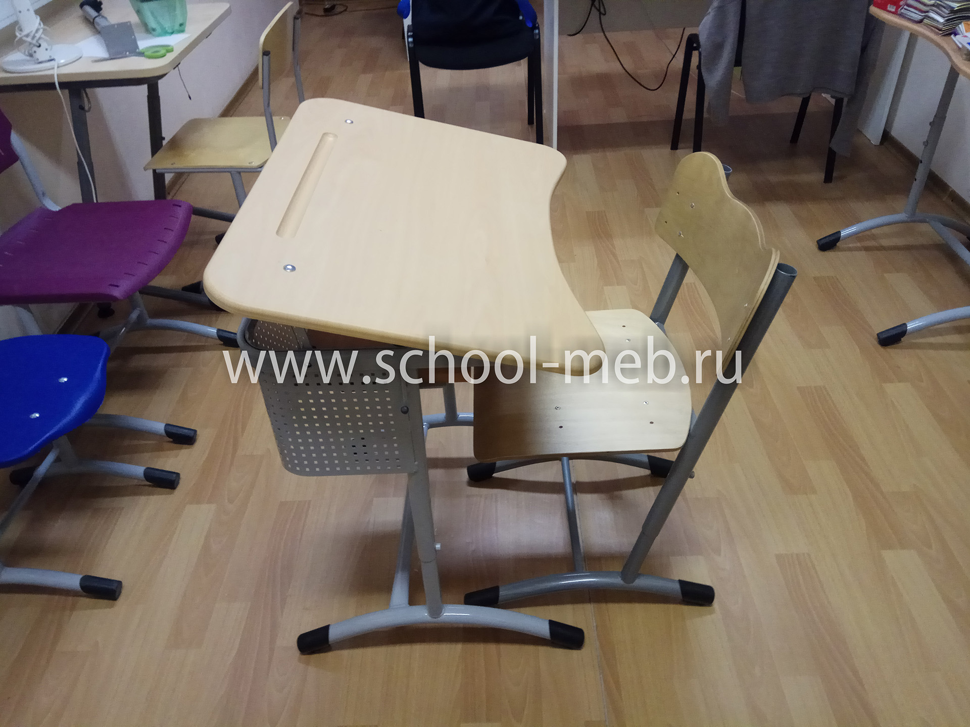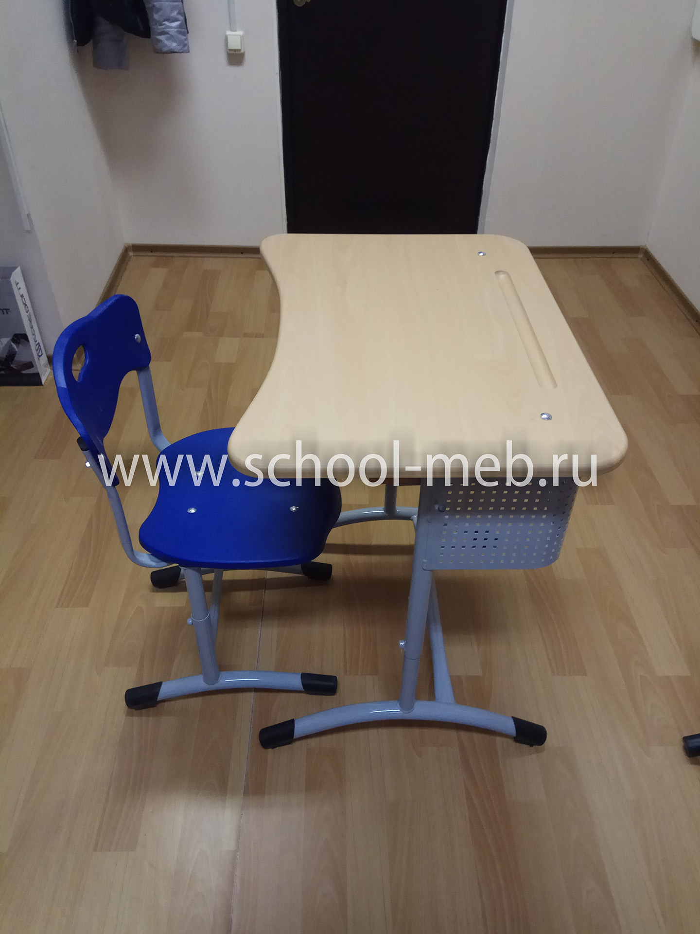 Основа парты - металлокаркас на круглой трубе - две боковые металлические опоры, окрашенный износостойким полимерным покрытием серого цвета с крючком для портфеля, к которым крепится горизонтальная столешница эргономичной формы. Ножки имеют пластиковые заглушки для предотвращения преждевременной порчи напольного покрытия.