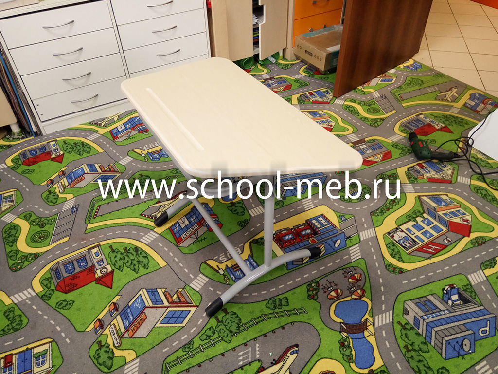 Механизм регулировки наклона столешницы состоит из металлической пластины толщиной 3мм с тремя профильными вырезами упоров, мебельного уголка и стальной заклепки. Механизм регулировки угла наклона позволяет регулировать наклон столешницы в диапазоне от 0°-15° с шагом в 5°, Подъемный механизм крепится к столешнице мебельным болтом и гайкой и с другой стороны, крепится к раме каркаса фиксатором через тяговую гайку-заклепку.