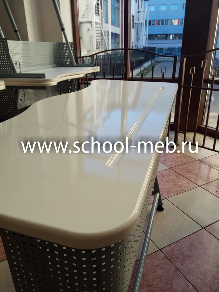 Столешница сделана из ламинированного МДФ толщиной не менее 16 мм. Все углы столешницы скруглены, по периметру столешницы сделана фрезеровка, столешница снабжена дугообразными эргономичными вырезами со стороны посадки ученика и фрезерованным желобом под карандаши. Размеры столешницы 1200х500мм. Столешница к каркасу крепится через две карточные петли шестью саморезами с пресс шайбой 4.2 х 16 (DIN968).