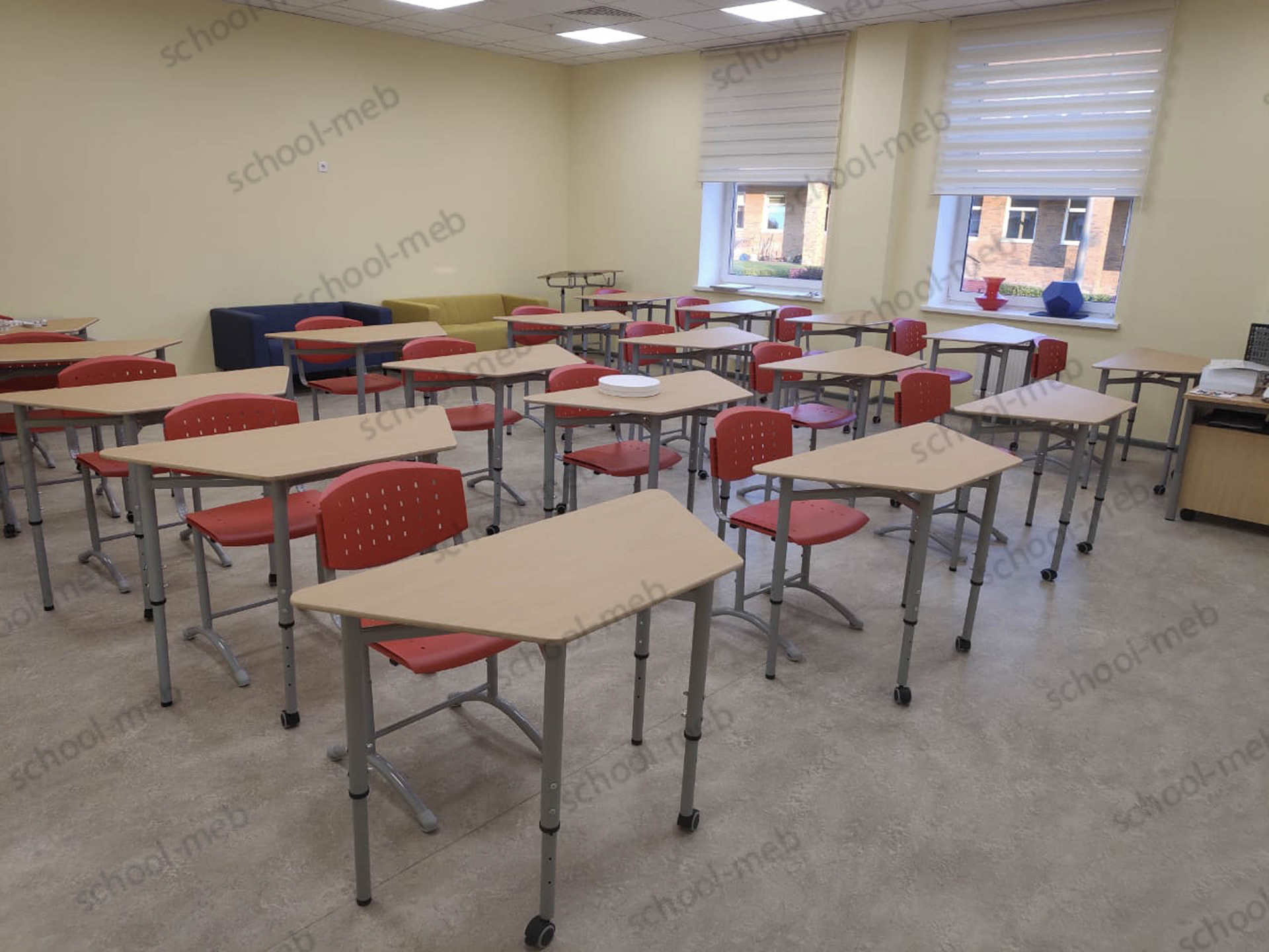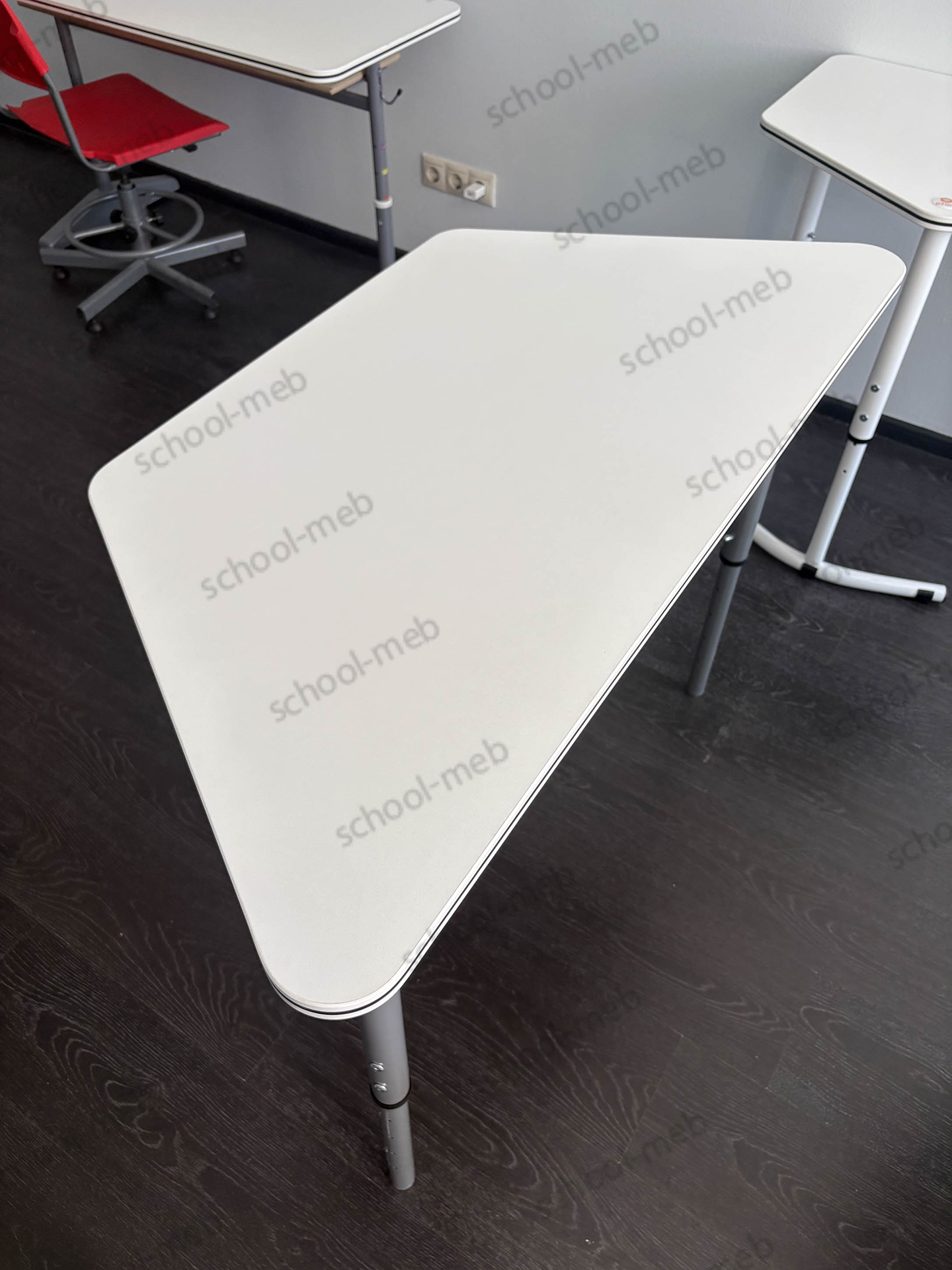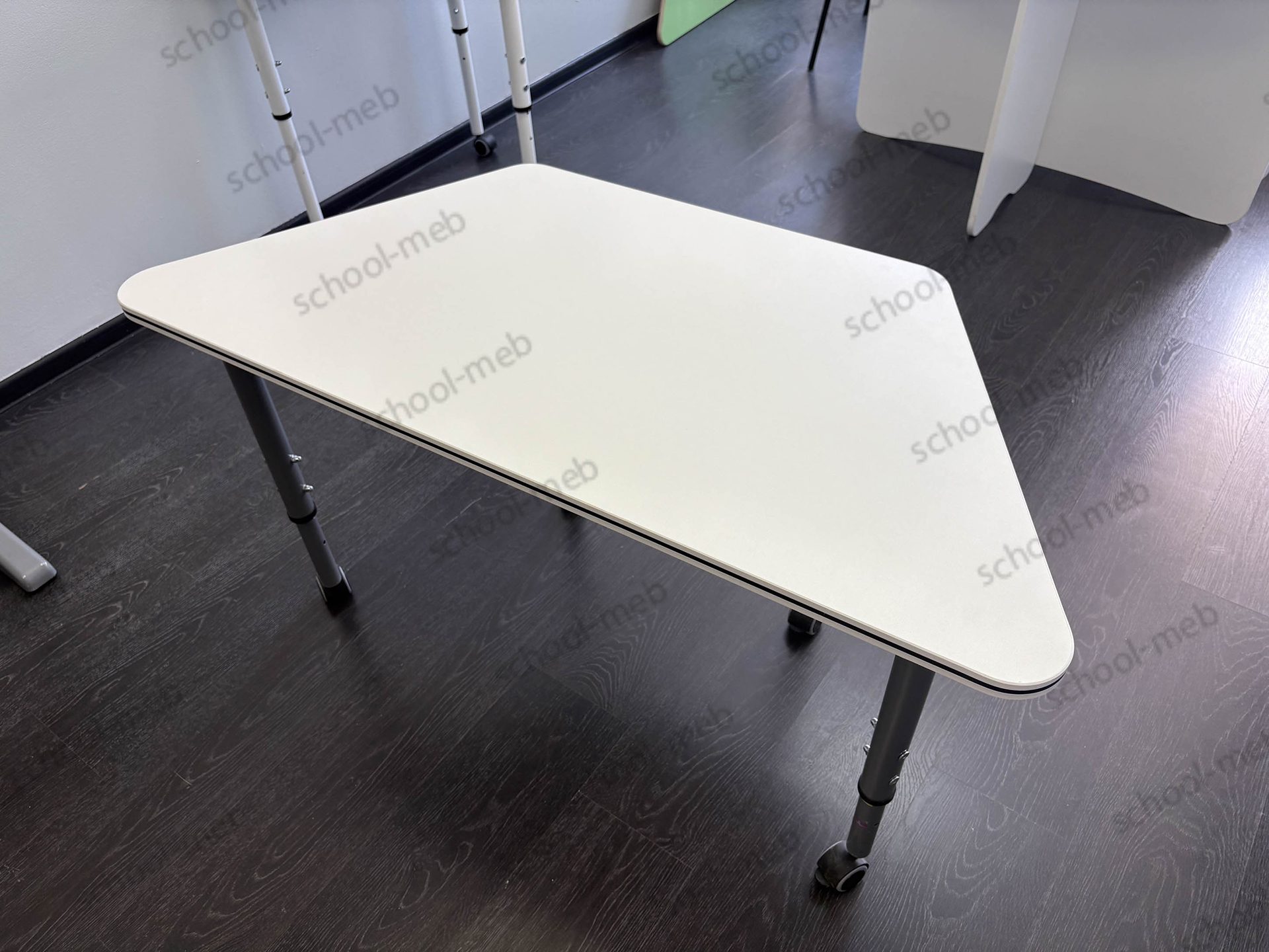 Форма столешницы имеет в своей основе трехстороннюю равнобедренную трапецию с длиной основания 1200 мм.и длинами сторон 600 мм.Комбинация двух столов образует равносторонний шестиугольник с длиной стороны 600мм. Комбинация трех столов образует правильный (равносторонний) треугольник с длиной стороны 1200 мм. Комбинация 6 столов образует правильный шестиугольник со стороной 1200 мм. Кроме указанных вариантов, форма стола позволяет формировать произвольные комбинации.
